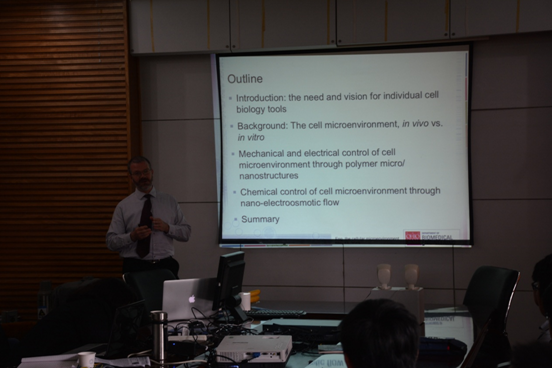 5月13日上午9:00在科大西区力二楼302会议室,Roberts教授首先为大家带来了一场题为《Engineering Vision: Biomedical Engineering applications in Ophthalmology》的精彩学术报告。报告主要阐述了角膜生物力学特性的实用测量方法。随后,Hansford教授作了题为《Engineering the cellular microenvironment》的报告,向大家介绍了控制细胞的机械和化学微环境方面知识。两位教授还与现场师生进行了互动,不少同学踊跃的提出了问题,两位老师也作了耐心的回答。报告结束之后,两位教授来到学校微纳中心、生科院公共实验平台以及工程学院相关实验室进行了简短的参观。实验室的部分同学用英文向他们介绍了自己的项目,得到了教授们的赞许。