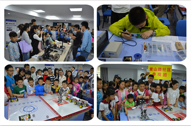 进入工程科学学院科普点,首先来到的是机器人制作体验展区。在第一展区,科大robomasters战队为大家展示他们的比赛机器人。采用麦克纳姆轮的步兵机器人,可以在地面轻易的完成前进后退、左右横移、越障等功能,还可以在受到外力干扰失去位置的情况下迅速复原。此外,战队成员还为大家介绍了他们的全自动战车、无人机等参赛作品。第二个展区是机器人制作体验区。从机械、电路、程序三方面为大家还原了机器人的制作过程,让大家了解到机器人也不是那么遥不可及的。最后一个展区便是机器人制作的成品展示区。会跳小苹果、俯卧撑、仰卧起坐的人形机器人,以及足球对抗机器人,又让大家惊呼:机器人原来还有这么多的玩法。机器人展区的展示也在这一阵阵的欢笑声和惊叹声中结束。