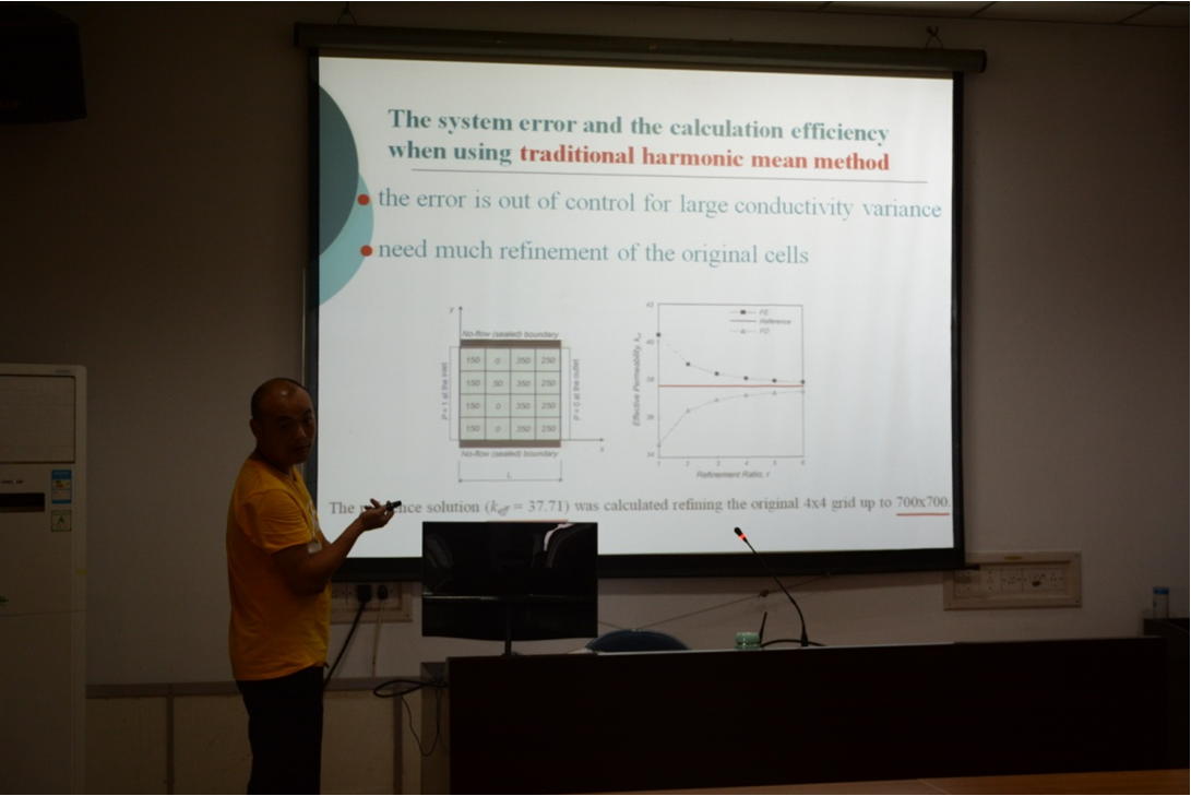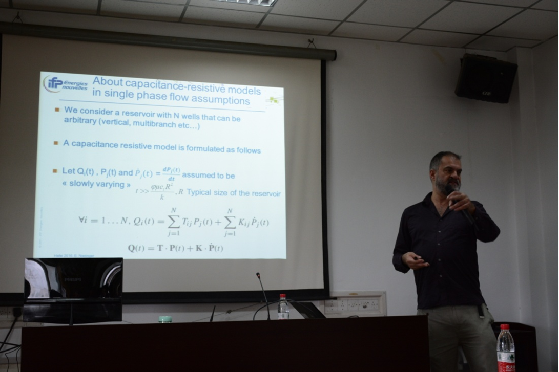 5月27日下午,Benoit Noetinger教授做了题为“Toward Simplified description of Reservoirs Using Quasi Steady State Storativity and Connectivity Matrix of Wells in 3D Heterogeneous Formations”的报告。在报告中,Benoit Noetinger教授提出一个简化的、适用于工程应用的油藏数值模拟快速算法,并详细介绍了他关于油藏数值模拟敏感性分析的最新研究工作。报告后,Benoit Noetinger教授与王晓宏教授课题组进行了深入的学术交流,听取了多名研究生关于渗流力学基本问题的研究进展,并就相关问题展开深入讨论。