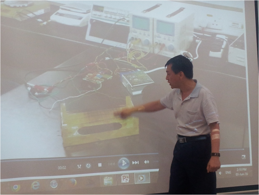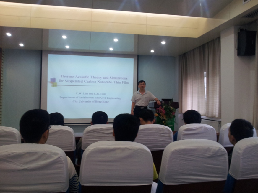 林志华教授详细介绍了他在悬浮碳纳米管薄膜热激发声波方面的研究。主要内容包括热诱导的声响应耦合模型,不同环境气体下的声场数值解,以及近场平面声波到远场球面声波的转化等。这些工作深入定量了碳纳米管薄膜单位面积比热容对声压响应的显著响应。最后,林教授还展示实验中了通过碳纳米管薄膜瞬态温度场调控产生的一些流行歌曲音响视频,引起了大家的高度兴趣。