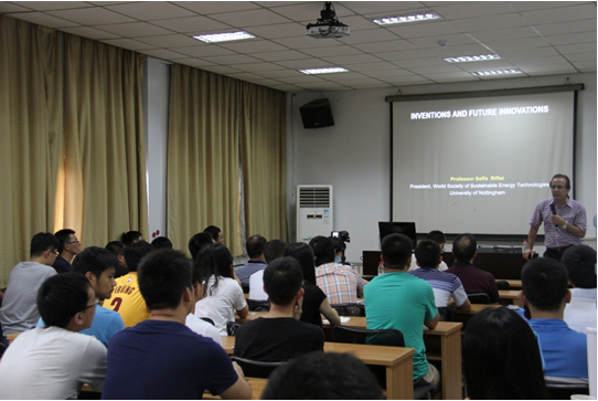 在报告中,Saffa Riffat教授针对在场学生强调了专利保护的重要性,以英国专利申请的流程为实例讲解了专利保护方面的知识,在此基础上讲述了101项发明在改变世界的进程中发挥的重要作用和原子弹对人类的巨大伤害,深刻探讨了科学在推动人类进步的同时隐藏的危险;另一方面,采用多个小视频的形式展现了科技感十足的未来生活、交通、农业以及城市,点明了上述研究领域中的研究热点。Saffa教授的本次来访为双方的进一步交流合作打下了坚实的基础。报告最后,Saffa教授针对学生提问,详细讲解了他对制冷技术、机器人技术、热科学和能源领域的研究热点、清洁能源与化石能源利用的对比和侧重等方面的看法,也为同学们提出了各个研究方向上的宝贵意见。