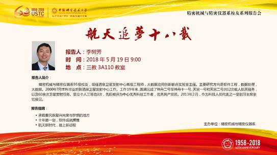 为迎接60周年校庆,5月19日,精密机械与精密仪器特邀请到95级李树芳校友,在我校第三教学楼A座110教室,作了题为“航天追梦十八载”的报告,讲述了自己十八年来的航天梦,报告由系党总支书记赵钢老师主持。