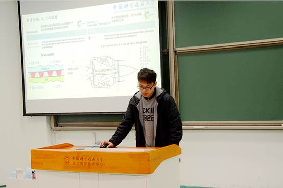 接下来由史翔超学长带来B类优秀作品展示。他创作的油水分离机器人曾获国赛三等奖。他以自己为例,告诉同学们找相关主题可以从生活出发,一些可能很小的创意,做出来也有意想不到的成果,他还告诉同学们不要害怕能力不足,要勇于尝试。