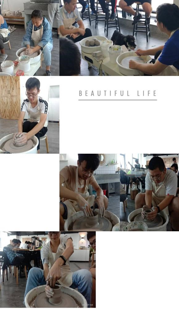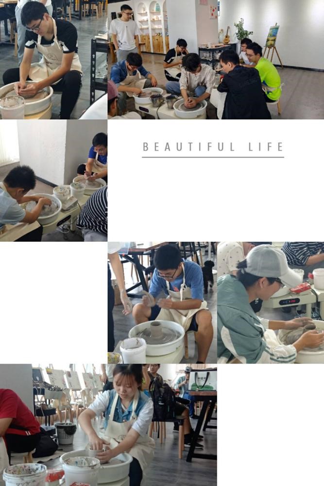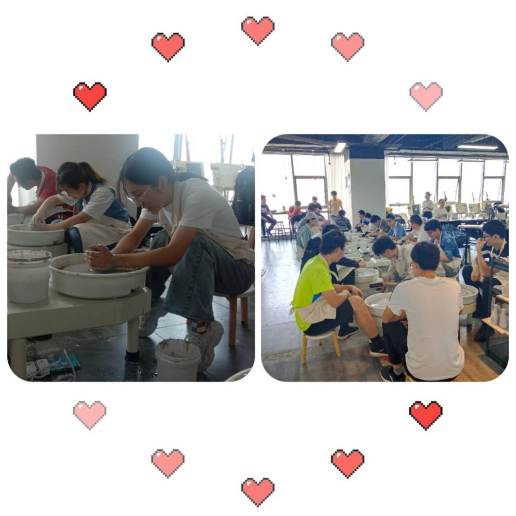 这次活动中,大家体验的是拉坯成型法制作陶艺。店里的工作人员向大家介绍:“在快速转动着的轮子上,将手探进柔软的泥土里,开洞。借助螺旋运动的惯力,让泥土向外扩展、向上推升,形成环形墙体......这就是拉坯。”看店家演示时,大家都觉得很新鲜,理论易懂,操作上看起来也很简单。然而当大家亲自动手去做的时候,发现并非像看起来那么简单。拉坯时的手法、方向、力度,转盘转速的调整,甚至小到手的湿润度,每一步都非常重要。任何一步做不好都会影响最终作品的美观,甚至可能无法完成。有些同学因为加水过多导致黏土全部旋出去,有些同学因为加水过少加大了手和粘土之间的摩擦力而使黏土从转盘上脱离。遇到挫折的同学们深刻体会到了工匠精神的重要性和理论与实践结合的重要性。我们要对每一步精益求精,在理解理论的同时,把理论应用到实际操作中也非常重要,这需要我们在不断练习中去感受体会。