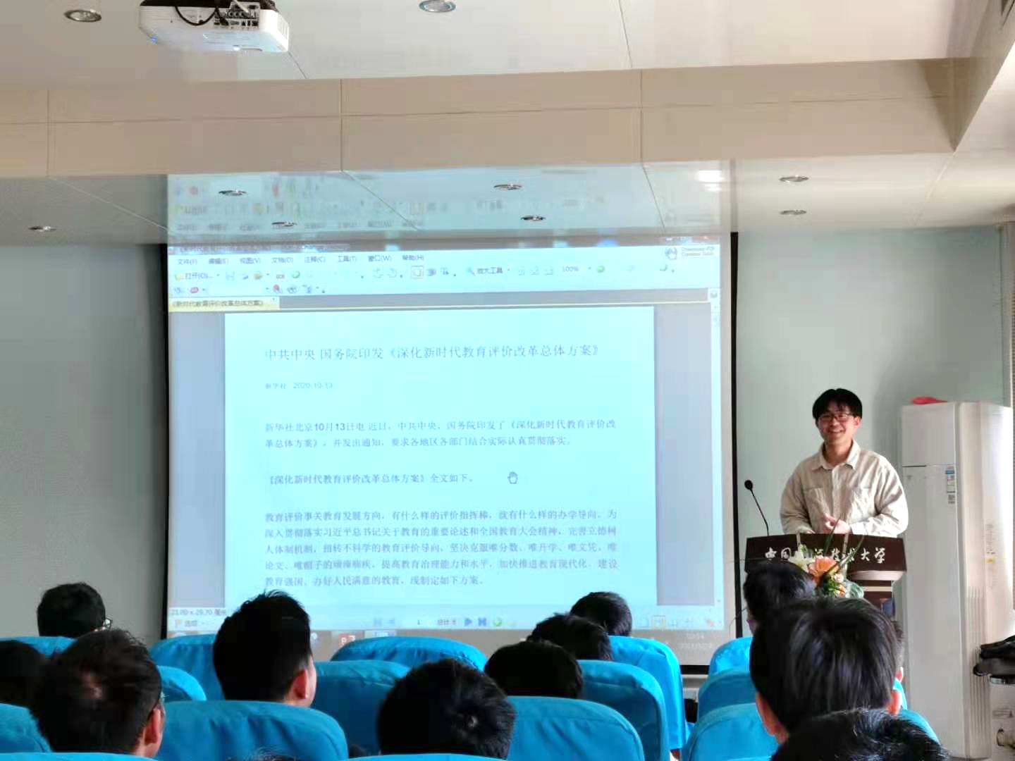 徐恒宇同学带领大家学习了《深化新时代教育评价改革总体方案》。首先进行了文件的整体学习,文件指出教育评价事关教育发展方向,有什么样的评价指挥棒,就有什么样的办学导向。要全面贯彻党的教育方针,坚持社会主义办学方向,落实立德树人根本任务。面向党委政府、学校、教师、学生、社会五类主体,提出了22项具体要求。然后他以去年香港地区发生的一系列KY开元·(中国)集团为例阐述了思想政治教育的重要性,“前特首董建华和数学家丘成桐指出:香港年轻人狂热参与黑色暴动的行为说明,香港通识教育失败,令年轻一代变得有问题。”最后他以近年来的翟天临、张裕卿等学术不端的例子,讨论严格学术要求,严惩学术不端行为,提出学术造假问题不能仅仅撤职了之,还要追究其法律责任。