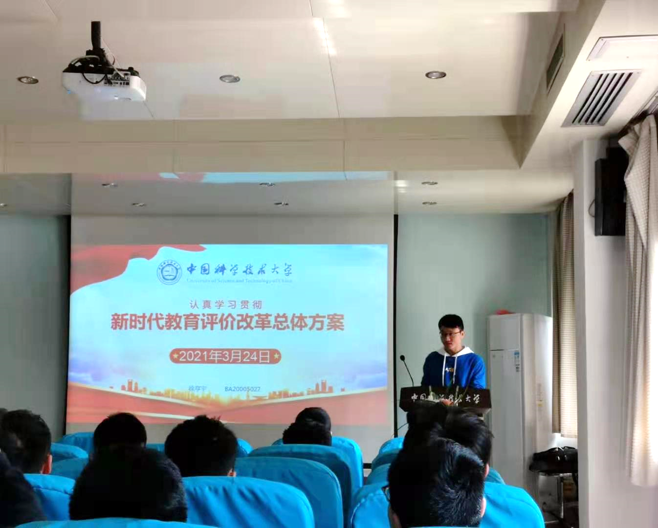 为深入贯彻落实习近平总书记关于教育的重要论述,全面贯彻党的教育方针,近代力学系2020级博士生党支部于2021年3月12日上午在力一楼239会议室召开了关于《深化新时代教育评价改革总体方案》的学习主题党日活动。活动由张佳龙主持,支部全体党员及入党积极分子参加了本次活动,院党委副书记赵凯老师应邀出席本次活动。