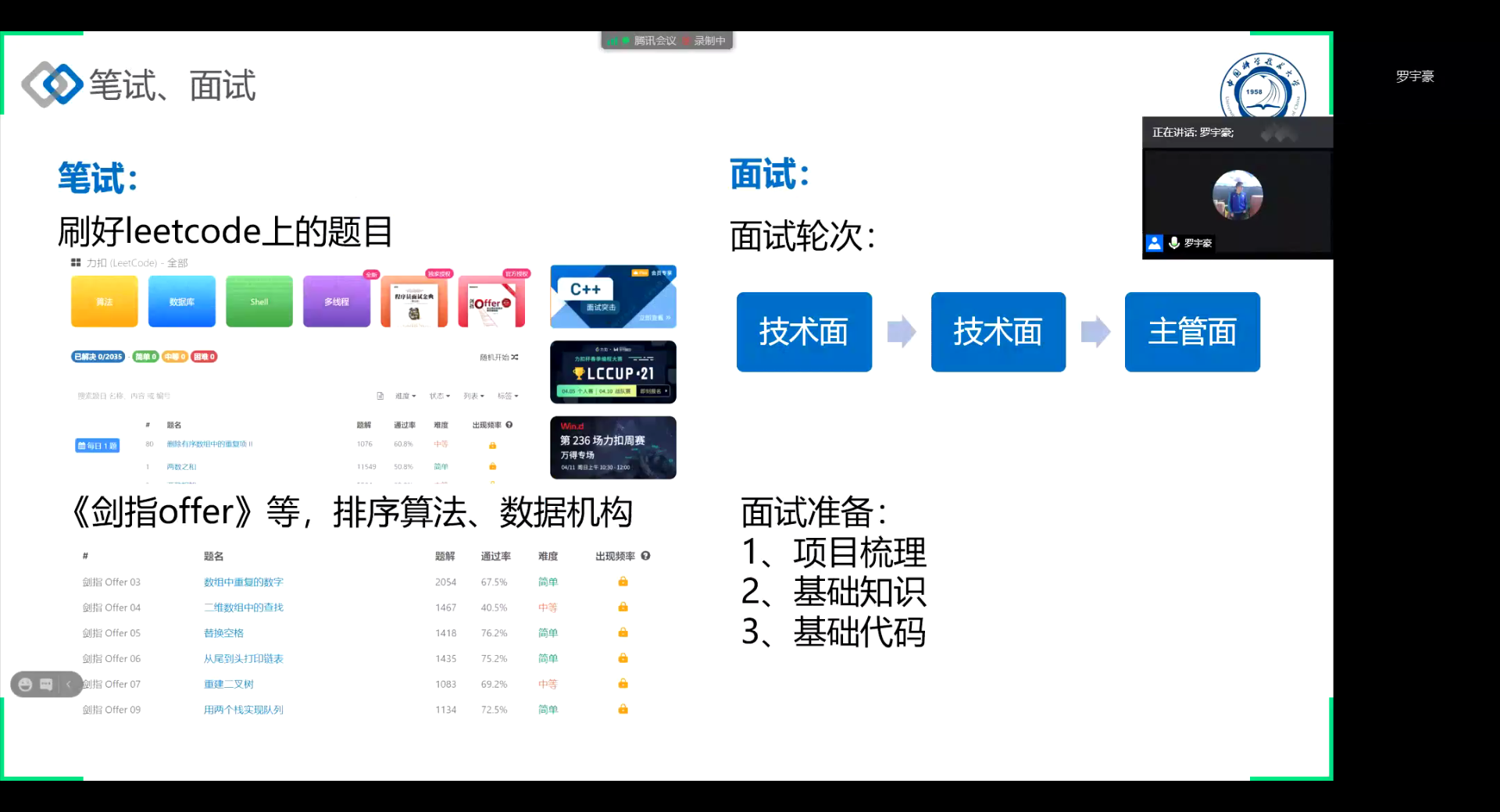 接着,罗宇豪师兄进行互联网公司求职的经验分享。他结合自己的亲身经历,介绍了互联网公司常见的岗位以及这些岗位的不同之处。主要从笔试,面试两方面详细讲解如何进行求职准备。他强调顺序算法和数据结构相关的题目在笔试中的重要性,并把面试分为两到三轮技术面和一轮主管面。从自身参加项目的梳理、基础知识复习、面试流程和面试问题等方面,指导大家如何进行面试准备。最后,罗宇豪师兄还就如何查询薪资、如何学习算法给出了建议。