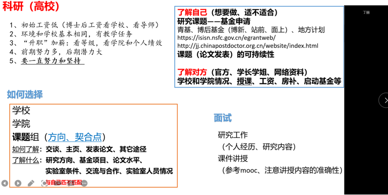 最后一位分享的嘉宾是丁丽师姐,她从不同性质单位的发展问题进行了经验分享。从初始薪资、增速、后期发展等方面,为大家详细阐述公司企业、研究所和高校单位的区别。最后对于选择博士后岗位,丁丽师姐建议我们一定要选择与自己合适的课题组,了解研究方向、基金项目、论文水平、实验室条件、合作交流、实验室人员等。