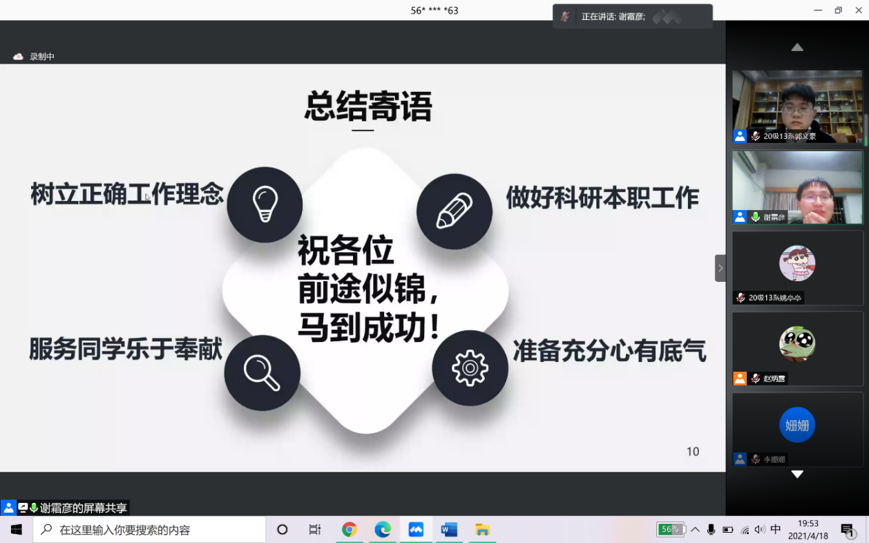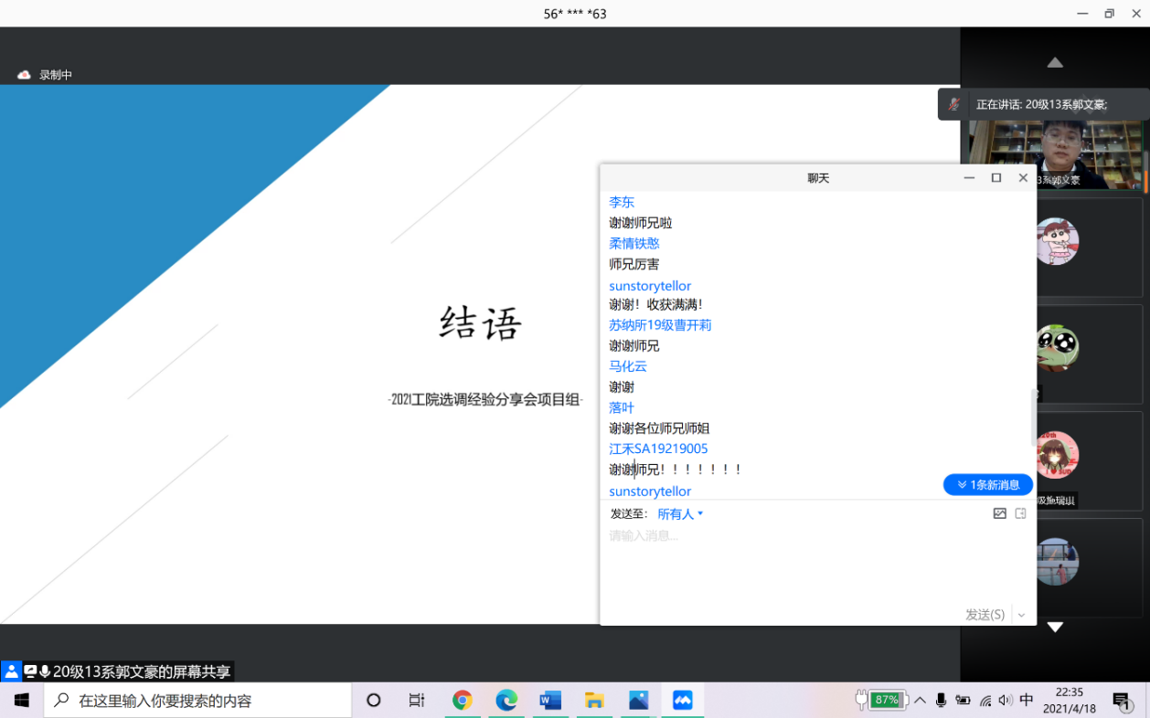 每位嘉宾分享完毕后,会议均提供了提问及讨论环节。同学们的提问热情高涨,互动环节累计持续近半小时,各位师兄师姐也耐心地为各位参会同学解惑释疑。至此,2021年工院选调生专题经验分享会圆满结束,参会同学纷纷在会议聊天室向5位师兄师姐表示感谢。