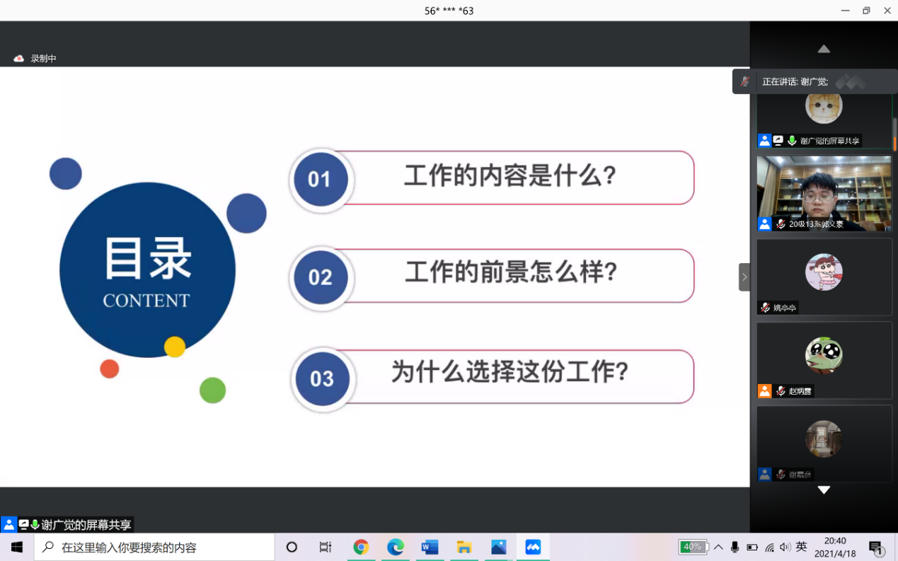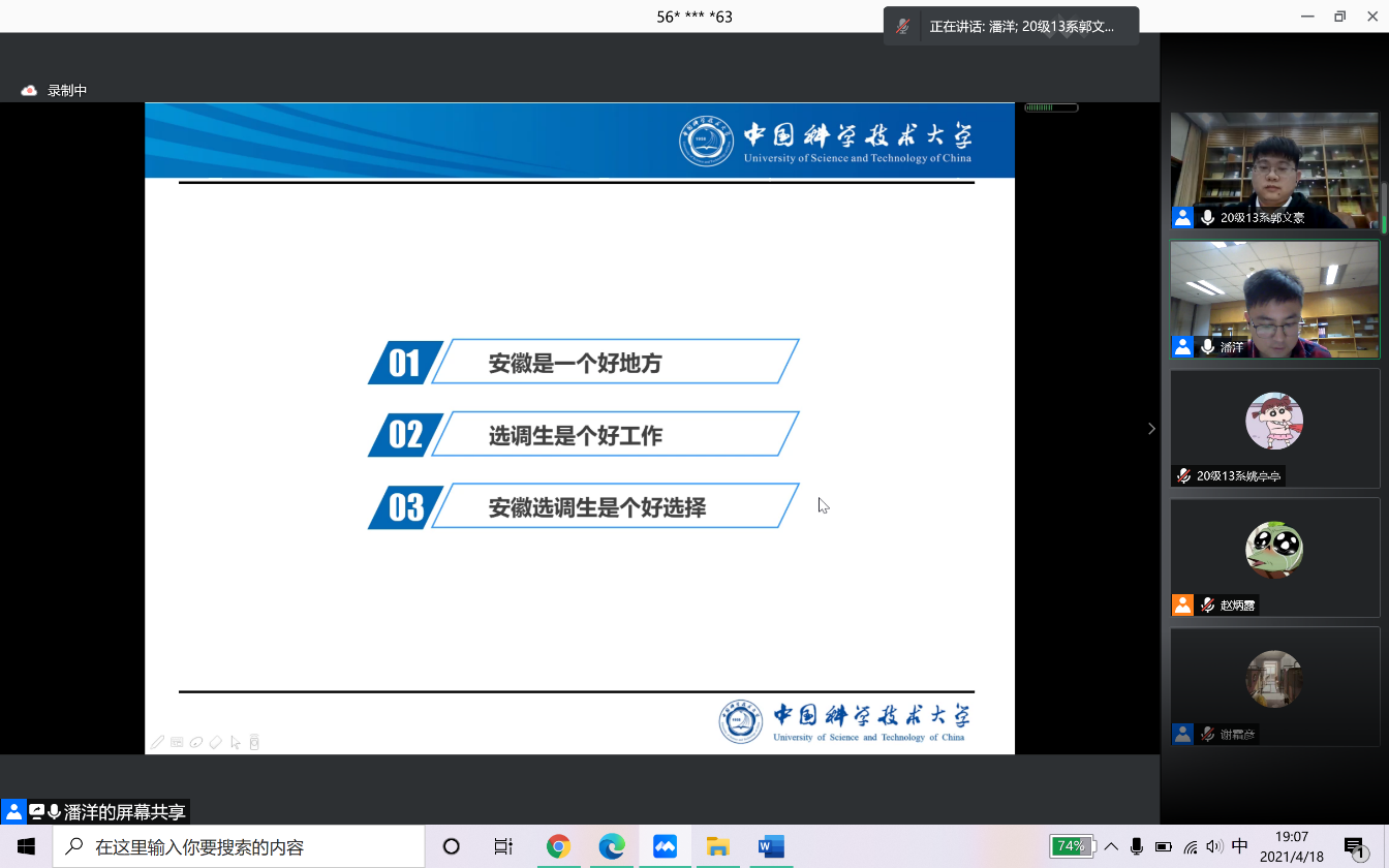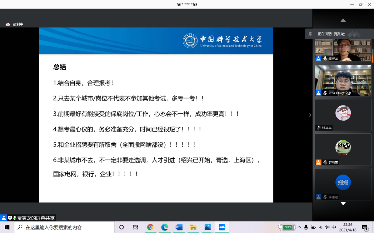 2021年4月18日晚7点,由中国科学技术大学工程科学学院团委主办,工程科学学院研究生会承办的2021年工院选调生专题经验分享会成功在线上举办。会议交流群在线人数接近500人,在线观看会议人数最高达到268人,分享会同时还提供了会议直播。