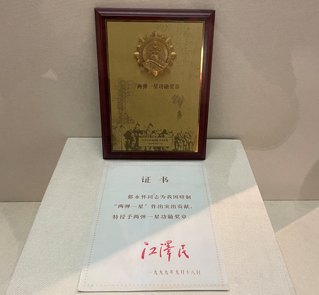 之后,讲解员同志介绍了科大与两弹一星元勋们的联系:我国一共有23位“两弹一星”元勋,其中有11位在科大工作过。他们分别是于敏、陈芳允、陈能宽、杨嘉墀、周光召、钱学森、程开甲、彭桓武、赵九章、钱三强、郭永怀。其中,钱学森冲破美国的重重阻碍,回国投身祖国建设,郭永怀飞机失事用身体护住绝密数据文件,老一辈科学家这种崇高的爱国主义情怀、无私奉献的大爱精神永远值得我们学习。2003年,郭永怀先生的两弹一星”功勋奖章由其妻子李佩捐献给了科大。