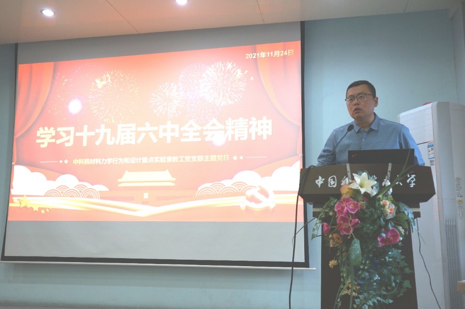 11月24日下午,中科院材料力学行为和设计重点实验室党支部在力学一楼239报告厅召开党员大会,学习党的十九届六中全会精神和安徽省第十一次党代会精神,支部书记王奉超主持会议并领学。