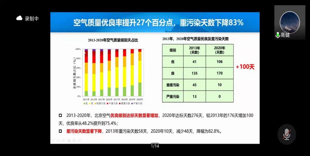 随着大气国十条和相关法律的颁布,以及产业、能源、交通结构调整等措施的实施,2013-2020年主要污染物浓度降幅显著可观。高所长以北京市为例,从PM2.5来源变化、空气质量优良率、重污染天数等多种角度展示大气污染防治攻坚战的显著成效。高所长提出,北京市1998年以来16阶段的治理经验是可复制并具有特殊性的,越来越多的城市将走上高质量之路。