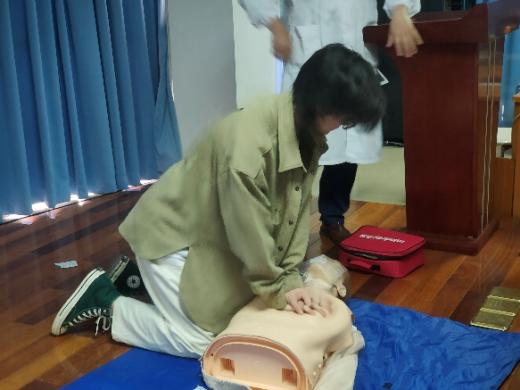 最后医师们将大家分成三组,每个组都分配了医用假人和AED除颤仪。三名医师分别现场教学演示,并让同学们上手操作。在实际练习过程中,医师对同学们的错误手法进行指正与示范,保证每个同学都真正掌握并能正确运用急救的相关知识。