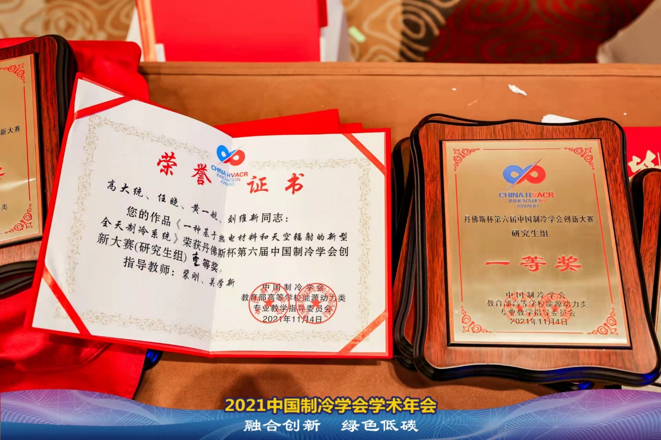 2022年3月9日,由中国制冷学会主办的“丹佛斯杯”第六届中国制冷学会创新大赛在广东省佛山市举行。工程科学学院热科学和能源工程系研究生高大统、任晓、黄一航、刘维新同学的参赛作品《一种基于热电材料和天空辐射的新型全天制冷系统》,经过初赛选拔和复赛推荐,顺利晋级决赛并代表中国科学技术大学获得本次大赛研究生组一等奖。本作品的指导老师为裴刚教授和关学新副研究员,裴刚教授同时获评本次比赛的优秀指导教师。