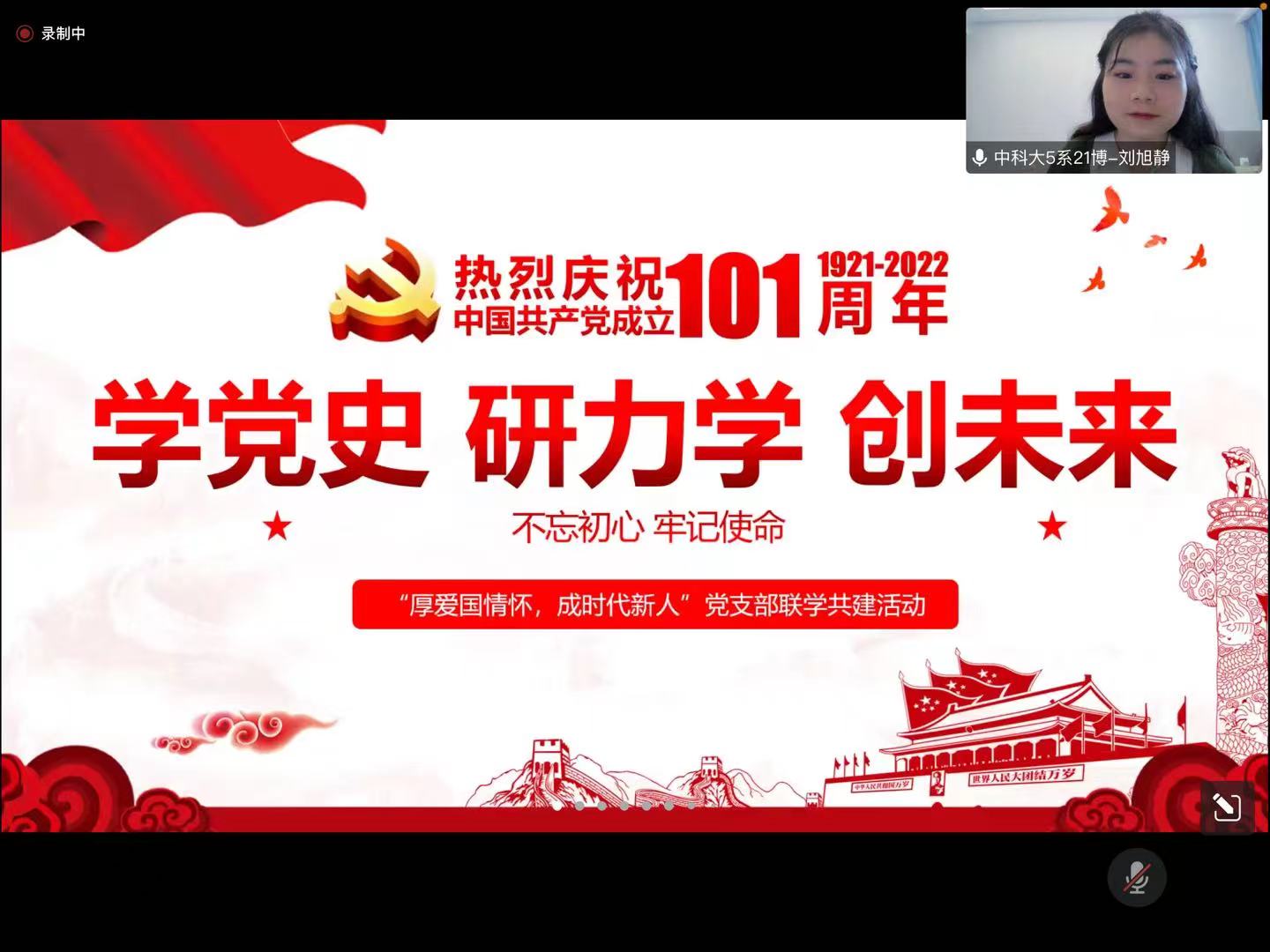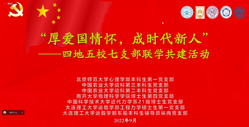 9月25日,中国科学技术大学工程科学学院近代力学系2021级博士生党支部联合大连理工大学、北京师范大学、中国农业大学、南开大学基层党支部线上开展了“厚爱国情怀,成时代新人”联学共建主题党日活动,来自5所高校7个研究生党支部的200多名学生党员参与了本次活动。