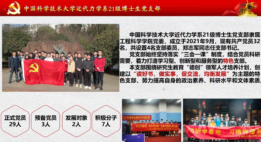 随后,各支部书记依次介绍了本支部在“三会一课”、党史学习教育等方面的特色做法。我校近代力学系2021级博士生党支部常务副书记刘旭静就本支部基本情况做了简要介绍,明确指出力争以“读好书,做实事,促交流,均衡发展”为目标创建特色样板支部。