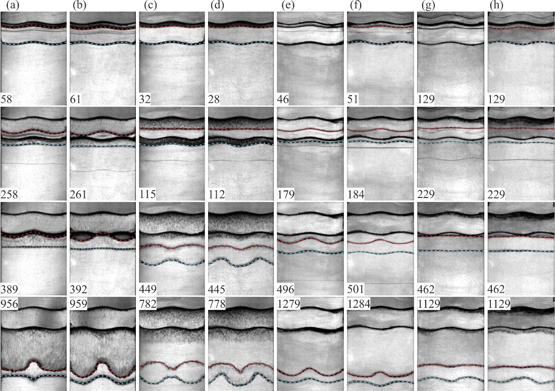 图1.激波诱导界面演化纹影图:(a)-(b)双气层,(c)-(d)单气层,(e)-(f)单界面。