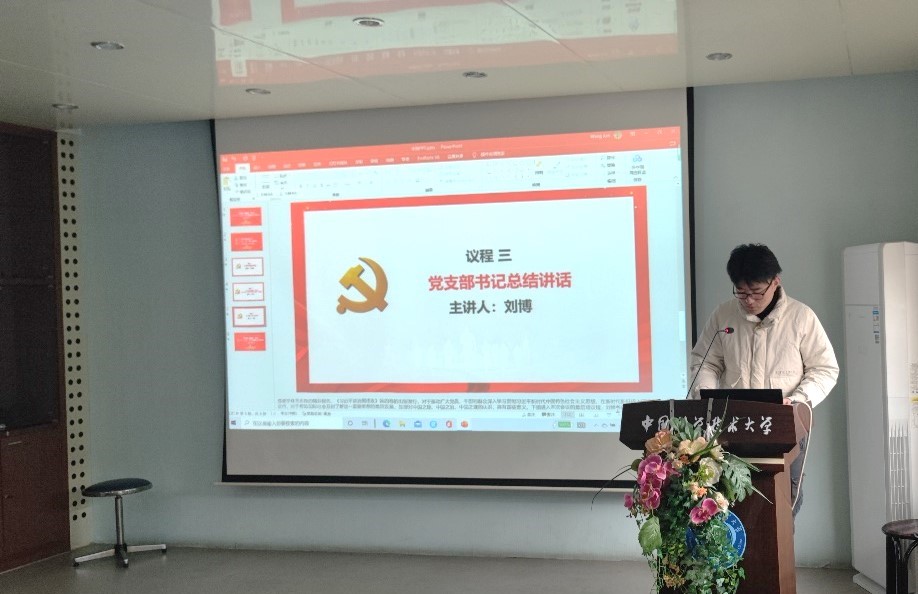 会议的第三项议程,党支部书记刘博汇报了党务工作。他总结了本学期支部活动情况,提出了支部下学期的工作计划,并主持开展了预备党员转正。会议最后,刘博对本次主题党日活动进行总结:“大家在科研的同时要加强理论学习,武装思想头脑;支部也将大力创新活动形式,积极推进学习型支部建设。”