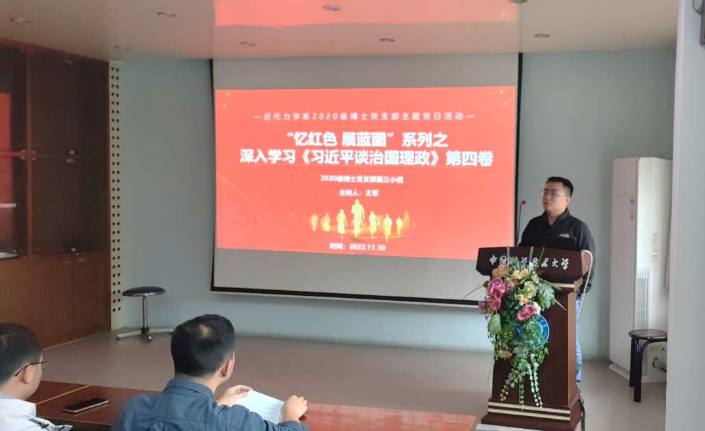 为庆祝党的二十大胜利召开,近代力学系2020级博士生党支部于11月30日开展了“忆红色 展蓝图”系列主题党日活动之深入学习《习近平谈治国理政》第四卷专题活动。本次活动由支部第三小组组长梅开男负责筹备开展,支部党员王军主持,全体党员、入党积极分子参加了此次活动。