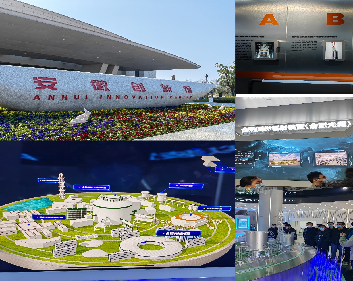 如果说美术馆是一本美学档案册,那么创新馆就是一个记录当代最前沿科技的美妙空间。同学们沿着习近平总书记的足迹,走进了安徽创新馆,实地感受安徽创新发展的历史进程和丰硕成果。在缺少讲解员的情况下,李晗老师直接化身为讲解员,为同学介绍了稳态强磁场、“小太阳”、墨子号卫星、OLED屏幕制备、语音合成、ChatGPT等前沿科技成果的基本原理,和同学们互动探讨关于科技创新与突破的最新形势,勉励大家瞄向世界科技前沿,扎实学习、矢志奋斗,为国家科技自立自强做出一份贡献。同学们还认真参观了“九章”量子计算原型机、新一代“嫦娥钢”、重组新型冠状病毒疫苗(CHO细胞)等最新前沿成果。