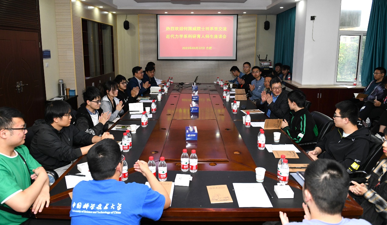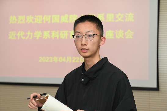 4月22日下午,近代力学系以“科研育人”为主题的师生座谈会在力学四楼二楼会议室举行。近代力学系主任何国威院士、学导孙德军教授、执行主任李二强教授、教学主任王海龙特任教授与近40名本科生代表进行了座谈。