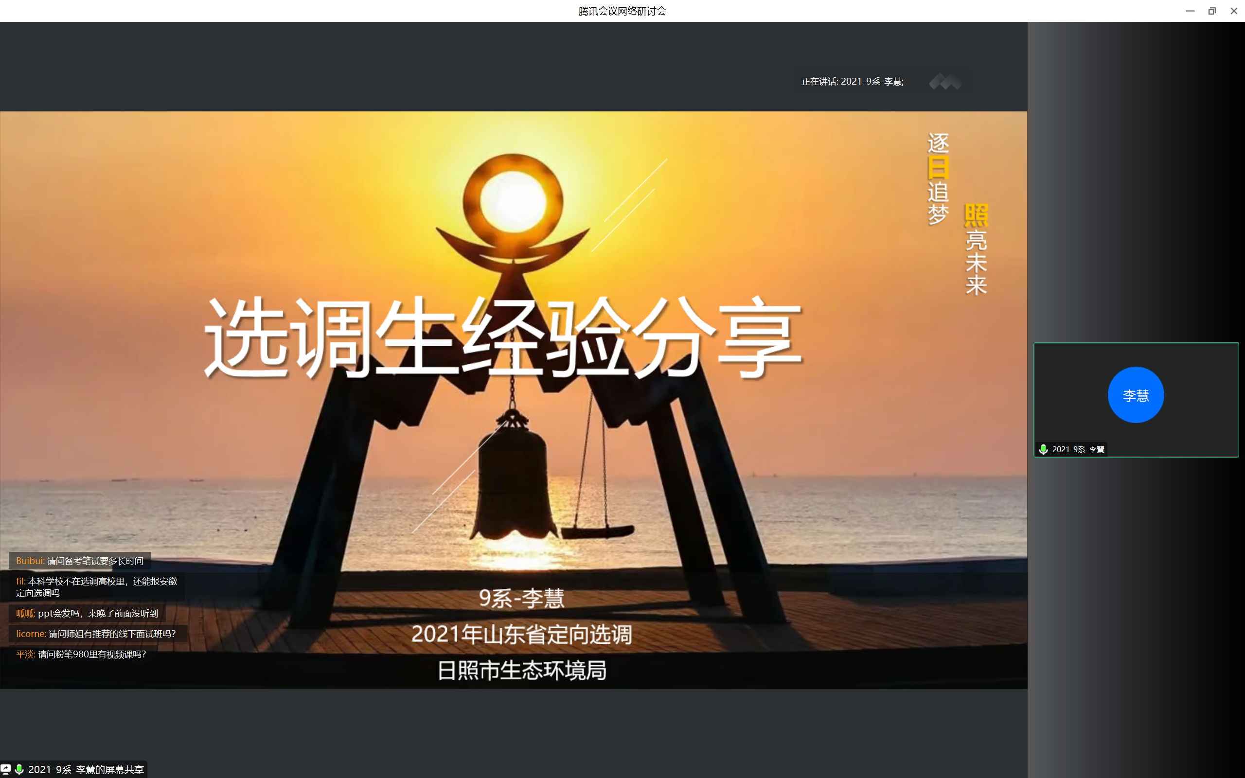 李慧师姐从选调生备考经验、选调生工作纪实、工作感悟体会三个方面进行了分享,在选调生备考经验部分,师姐详细讲述了查看公告—选岗—报考—笔试—面试—体检—政审—公示—报到的整个过程,在选调生工作纪实、工作感悟体会部分,师姐从自己的亲身经历出发,提醒同学们在工作期间要有一颗甘于奉献的心、有一支勤于表达的笔、有一双善于观察的眼睛。