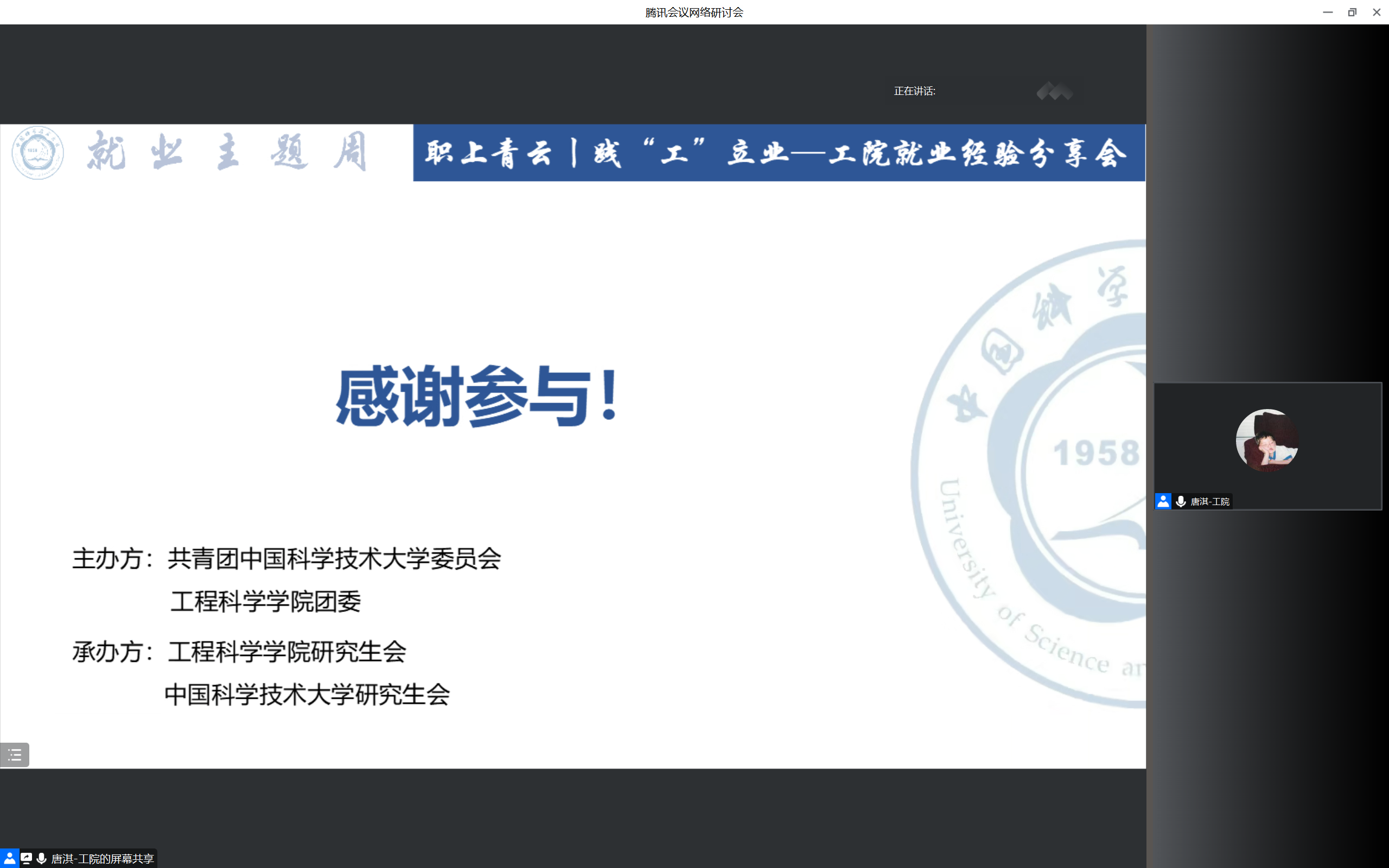 2023年4月15日晚19:00,工程科学学院就业经验分享会之企业篇通过腾讯会议线上召开。本场分享会邀请了19级热科学和能源工程系博士毕业生王储、19级精密机械与精密仪器系硕士毕业生周六建、19级精密机械与精密仪器系硕士毕业生左家乐、18级近代力学系博士毕业生姜富航四位嘉宾进行经验分享。