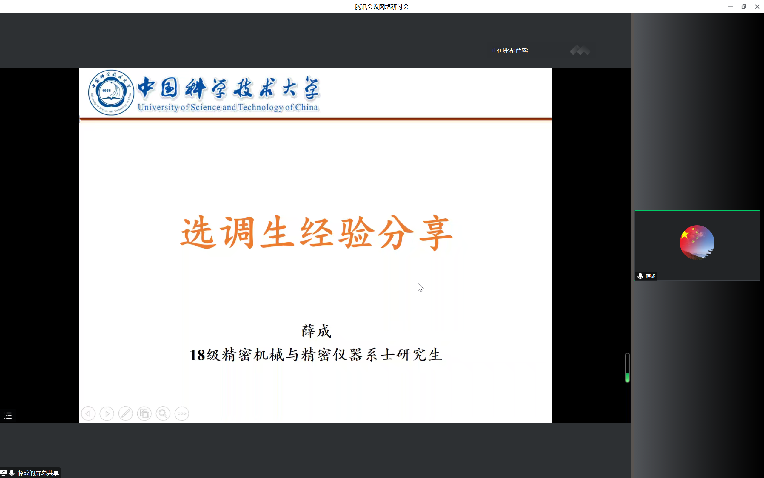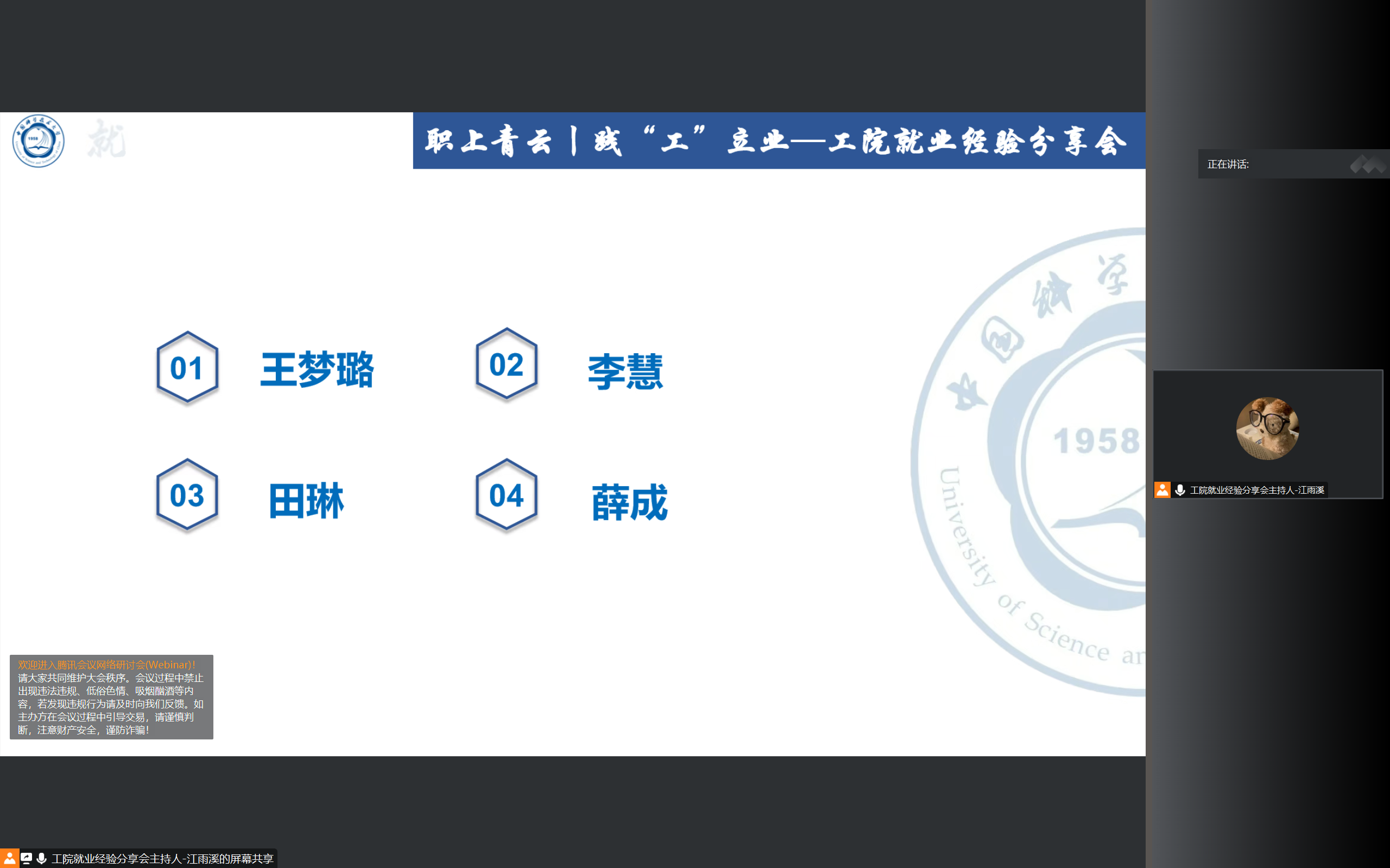 硕士毕业生李慧、18级近代力学系硕士毕业生田琳、17级精密机械与精密仪器系硕士毕业生薛成四位嘉宾进行经验分享。