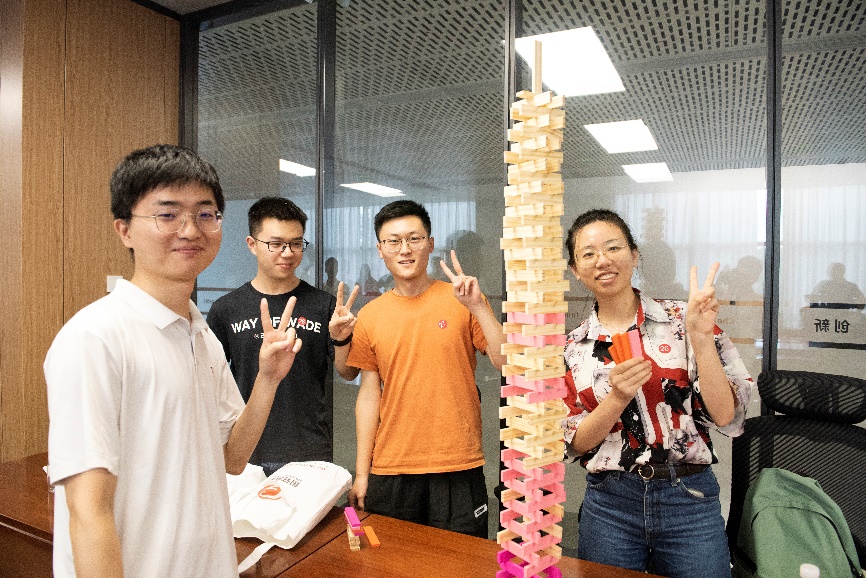 分享会结束后进行了互动环节。同学们分为四组,要求在十五分钟内,取得堆出最高的积木即为获胜。游戏中,同学们各显神通,尝试了不同的堆叠方式,最后组织方对积木高度、结构稳定性进行确认后, A组以稳扎稳打的积木塔取得胜利。之后,组织方综合活动过程中各位同学的表现,为其中五位同学颁发了“offer直通卡”,并鼓励各位同学加入到国轩高科的大家庭中。