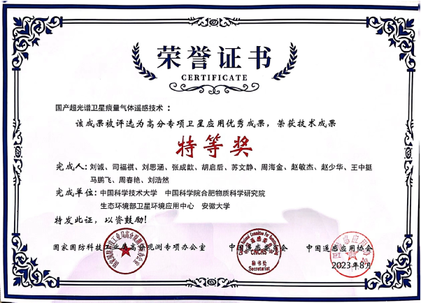 在大会开幕式上,隆重举行了国家科技重大专项“高分辨率对地观测系统”卫星应用优秀成果的颁奖仪式,我校工程科学学院刘诚教授团队的“国产超光谱痕量气体遥感技术”成果荣获该奖项的技术成果类“特等奖”,我校为该成果的第一完成单位,刘诚教授为第一完成人。