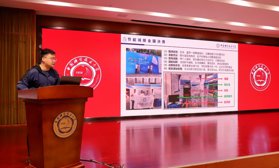 姚禹作为第十六届全国大学生节能减排社会实践与科技竞赛二等奖的代表向老师和同学做了作品展示与经验交流。他向在场的同学们介绍了其团队作品亮点,分享了参加节能减排创新大赛的基本流程及宝贵经验。
