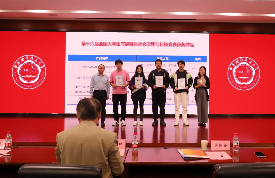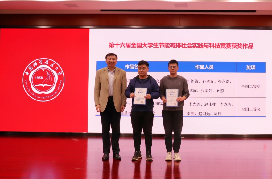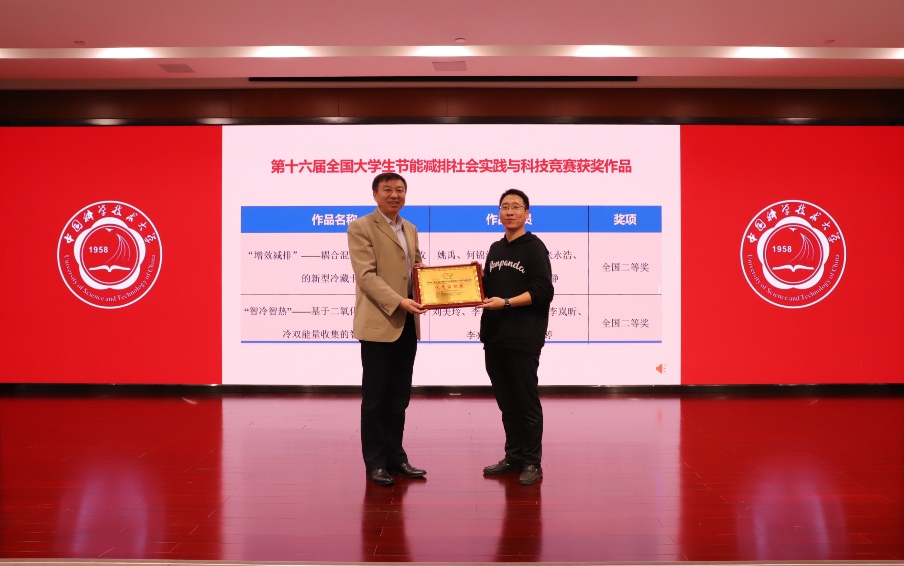 舒歌群还为大赛组委会颁发了优秀组织奖,工程科学学院团委书记王储作为第九届中国科大节能减排创新大赛组委会代表上台领奖。