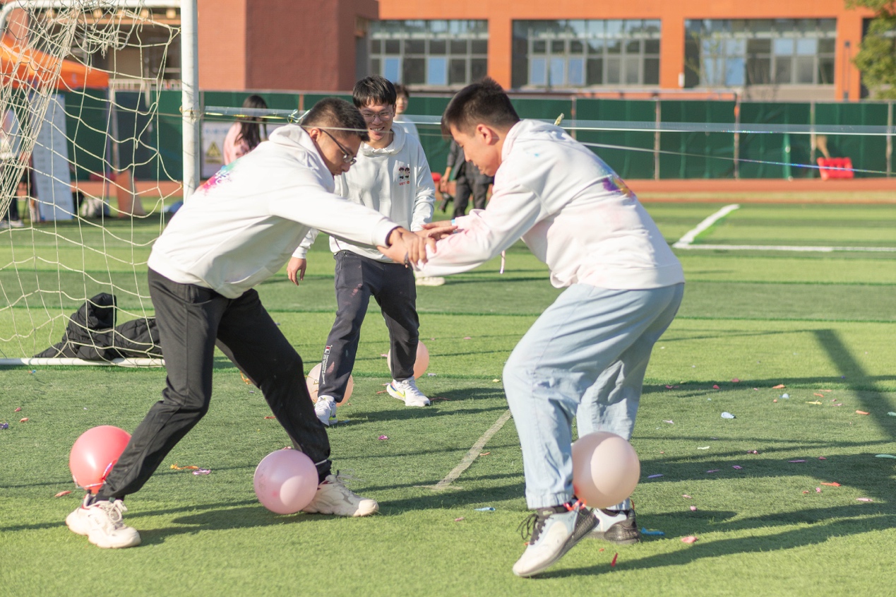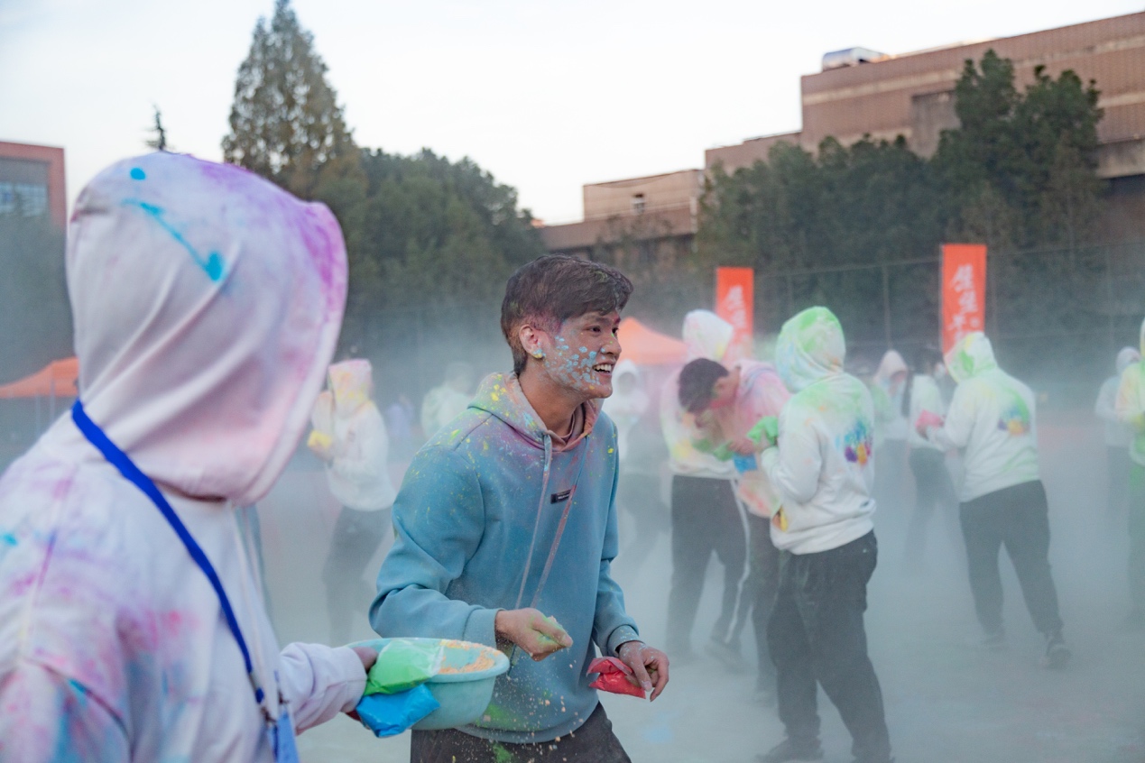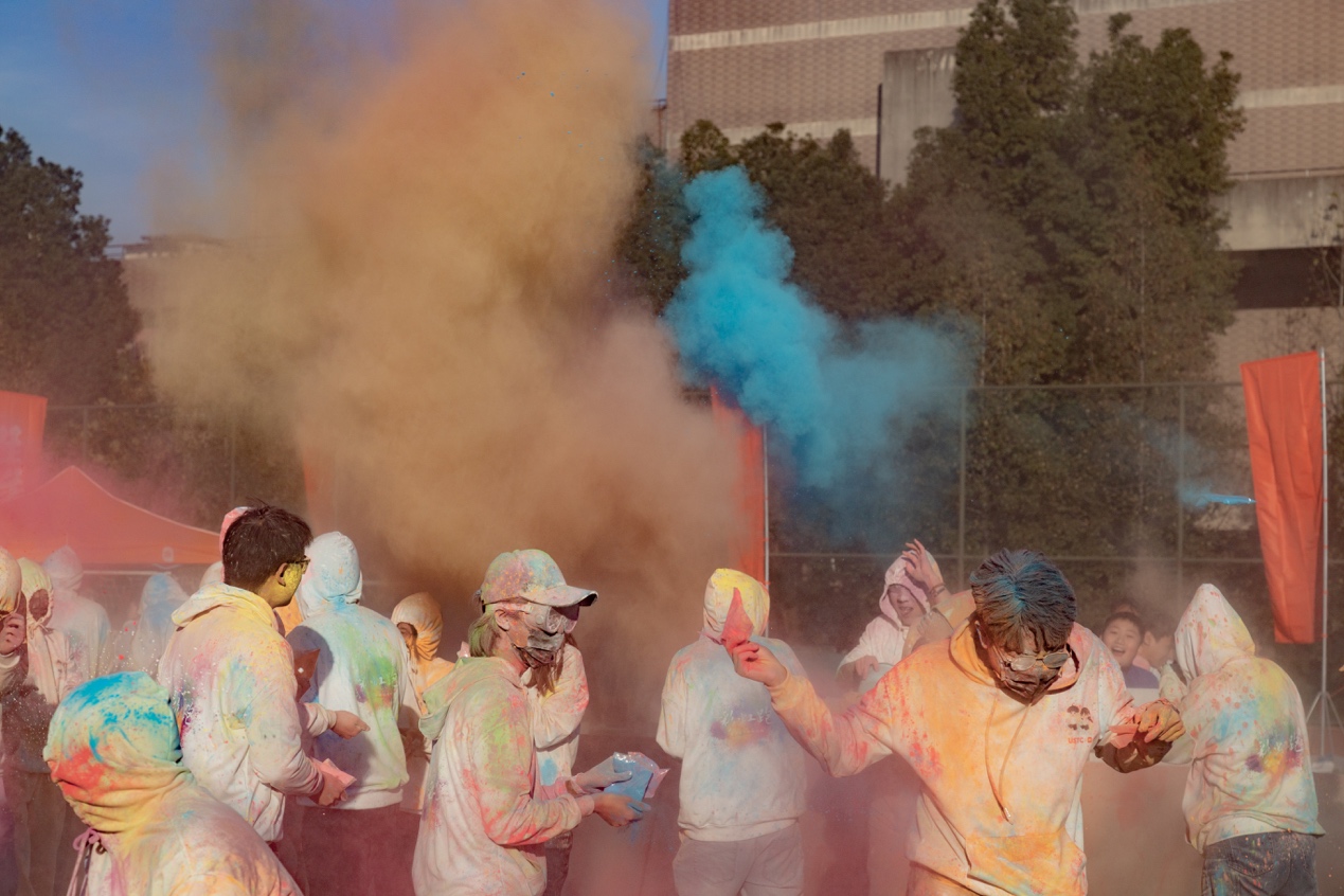 游戏过后,最受期待的压轴活动“彩虹狂欢”登场。现场师生纷纷进入“狂欢区”场地,在狂欢区内肆意奔跑,挥洒彩粉。此时这片区域内没有陌生人间的拘谨,互相喷洒的彩粉是对彼此的最好祝福。狂欢过后,从狂欢区内走出的一个个“彩虹人”脸庞上无不洋溢着灿烂的笑容。在阳光的照耀下,在现场动感的音乐中,大家七彩的装扮展现着科大校园生活的五彩缤纷。