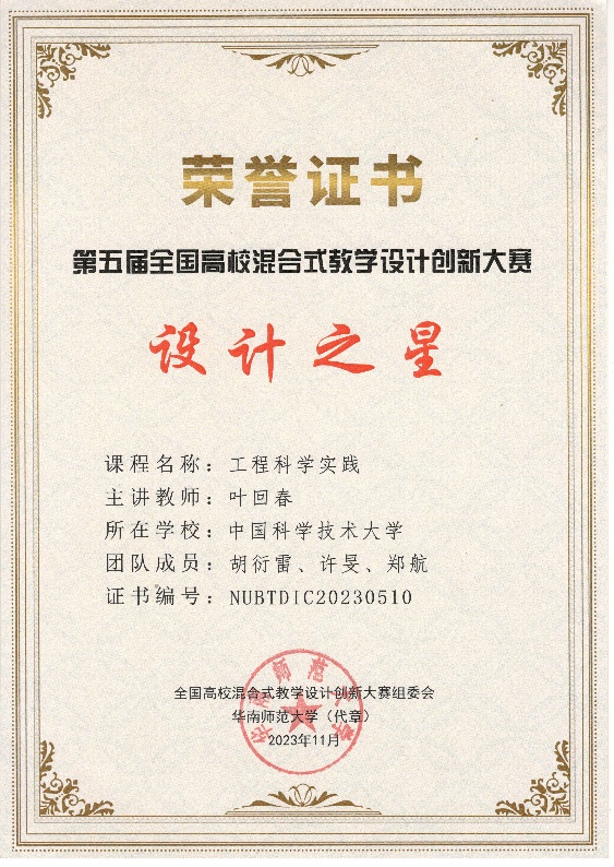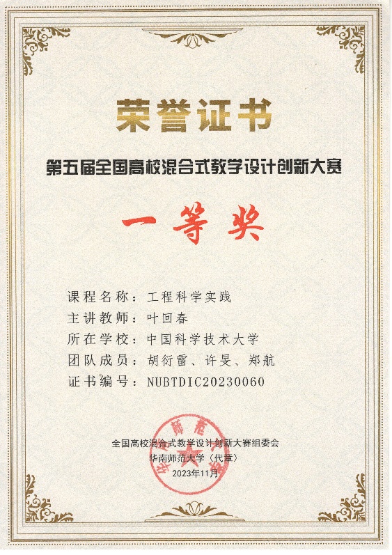 近日,“第五届全国高校混合式教学设计创新大赛”在华南师范大学广州校区石牌校园落下帷幕,我校工程科学学院叶回春老师主讲的《工程科学实践》课程荣获全国赛一等奖,并荣获“设计之星”称号,团队成员为胡衍雷、许旻、郑航。