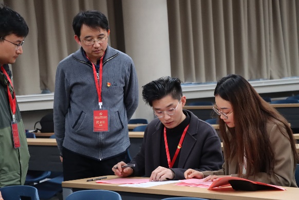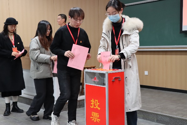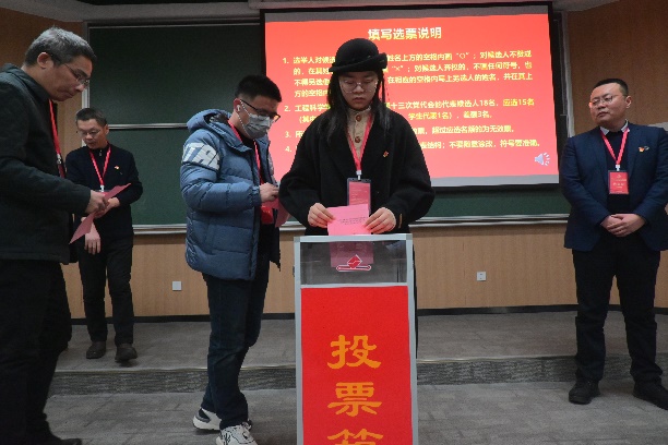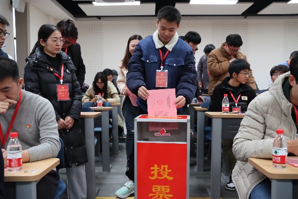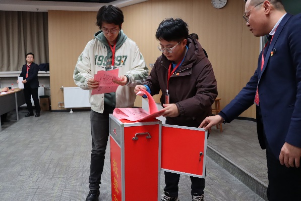 大会选举阶段,监票人当众检查票箱,计票人在监票人监督下向与会人员分发选票,总监票人就填写选票注意事项进行说明。在选票填写结束后,监票人、计票人、党员代表依次进行投票。