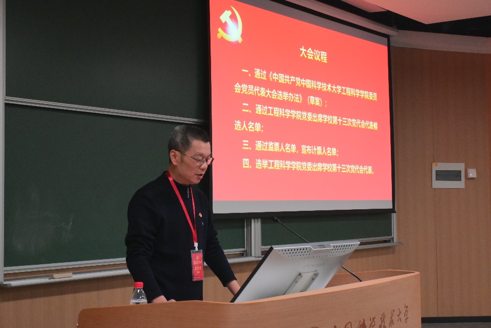 会议在雄壮的《国歌》声中正式开启。按照大会议程,大会分别通过了《中共中国科学技术大学工程科学学院委员会党员代表大会选举办法(草案)》、院党委出席学校第十三次党代会代表候选人名单、总监票人和监票人名单,宣布总计票人、计票人名单。
