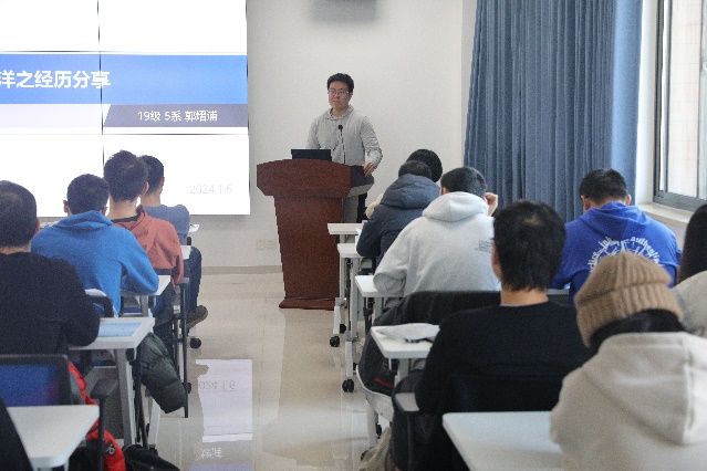 参与暑研交流的徐柳骏与申请出国深造郭熠浦同学作为学生代表结合自己出国学习体验,与同学们分享了学习体验和感悟。