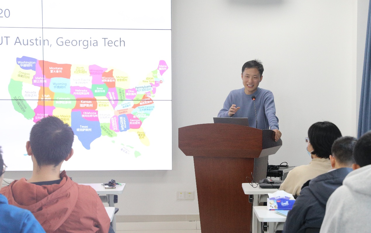 王柳教授以风趣幽默的语言向在场同学分享了自己的出国留学经历。他从出国留学的准备工作、导师的选择等几个方面给同学们提出了宝贵的建议,强调了交流及选择的重要性,希望大家早做规划,付诸实践。