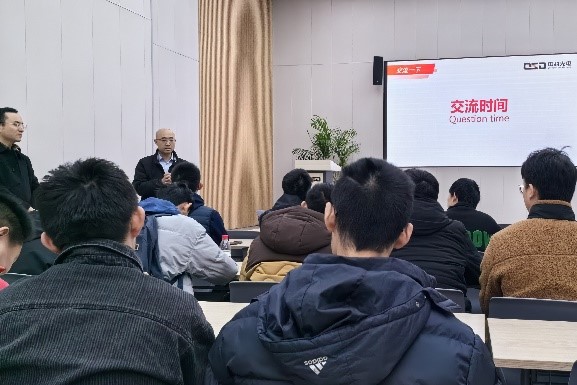 之后,同学们与我校精密机械与精密仪器系校友、中科光电副总经理赵猛学长进行了深入交流。赵猛为同学们介绍了中科光电的基本情况,重点展示了企业自主研发的关键核心技术,并分享了自己从事光电技术研究和企业管理的经历和心得。班主任范煜介绍了力学英才班和强基班基本情况、班级特色和培养成效。最后同学们围绕企业战略管理、技术产品开发、自身能力建设等方面进行了提问与交流,现场氛围温馨而热烈。