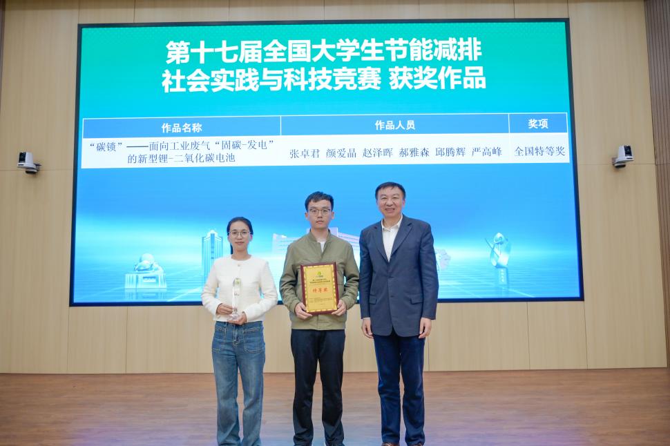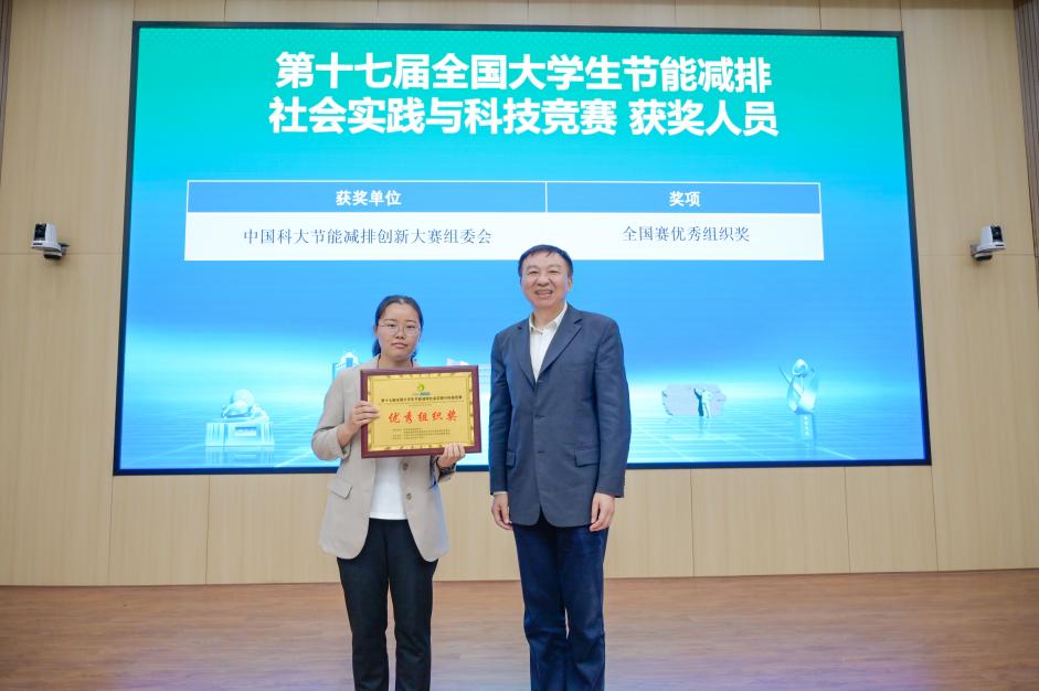 舒歌群还为大赛组委会颁发了优秀组织奖,工程科学实验教学中心倪青代表中国科大节能减排创新大赛组委会领取全国赛优秀组织奖。