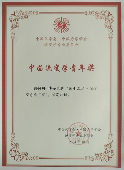 为了奖励积极投身流变学事业、取得突出成绩且未满35岁的优秀青年学者,中国化学会中国力学学会流变学专业委员会于1999年设立了中国流变学青年奖,每两年评选一次,每次不超过3名获奖者。依据奖励评选条例,中国化学会/中国力学学会流变学专业委员会于2023年8月至2024年7月进行了“第十三届中国流变学青年奖”的推荐和评选工作。经专业委员会委员提名推荐和通信评议,共确定中国流变学青年奖正式候选人7名。2024年10月26日,专委会组织了现场答辩。经无记名投票表决,孙帅帅博士和青岛大学的杜聪博士和北京航空航天大学的谢驰宇博士获此殊荣。