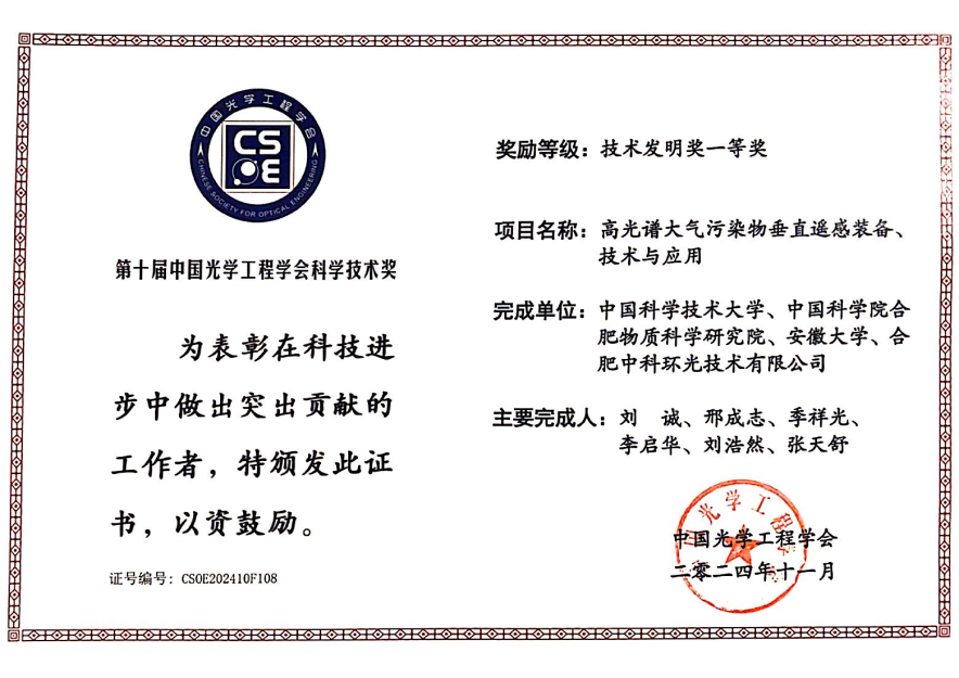“中国光学工程学会科学技术奖”分为自然科学类、技术发明类和科技进步类三个类别,每个类别分别设有一等奖、二等奖和三等奖三个奖励等级。技术发明奖旨在奖励在光学工程领域科学研究、技术创新与开发、科技成果推广应用和实现产业化方面取得卓著成绩或做出突出贡献的个人和集体。本次刘诚教授团队荣获技术发明一等奖,充分体现了学院在科学技术研究及开发、科技成果推广及产业化应用方面取得良好成效。