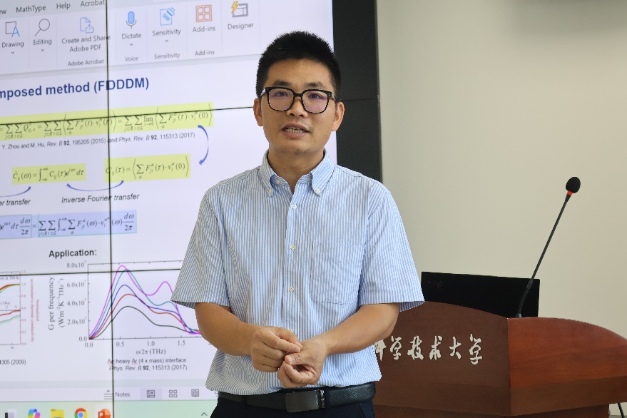 在本次报告中,香港科技大学周艳光副教授围绕课题组在“复杂体系中热输运机制探索与应用”方面的研究展开系统讲解。报告主要分为两个部分:首先是在基础层面,介绍课题组开发的热载子表征算法与多尺度非平衡热输运建模方法,重点解决在非晶材料、多组分体系、异质界面中,如何准确识别并模拟热载子的输运行为,从而揭示其微观机理。这类算法已经成功应用于多种纳米材料与异质结构体系,为优化热电与半导体材料的热性能提供了理论支持。其次,在应用层面,周艳光副教授介绍如何通过分子修饰、材料界面调控与MOFs(金属有机框架)等吸附性材料的表面工程设计,来合成具有高散热效率的表面与高热阻调控能力的界面。此类材料不仅在电子元件热管理中展现出显著优势,也为热调控涂层与新型能量转换器件的设计提供了新思路。