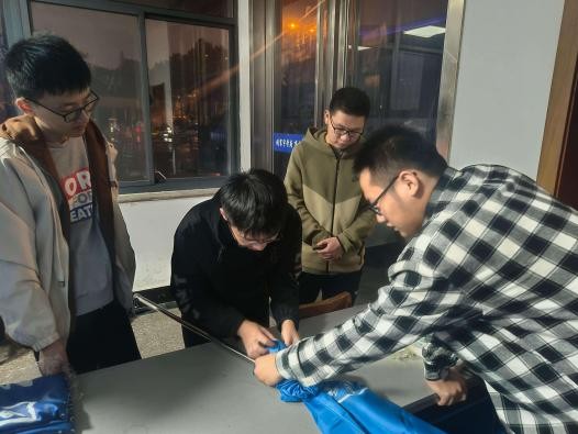 在分组实操环节,全班同学分为若干小组,每组配备一名护卫队成员进行“一对一”指导。同学们认真练习,从整理旗面到精准打结,再到扯出层次分明的花瓣,最终成功绑出一朵朵整齐美观的旗花,现场氛围热烈而有序。
