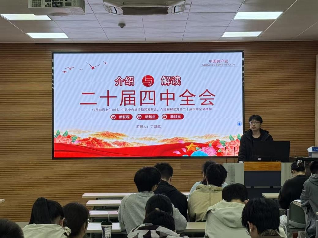 丁凯歌首先介绍了二十届四中全会召开的背景与重大意义,重点解读了全会审议通过《中共中央关于制定国民经济和社会发展第十五个五年规划的建议》,强调制定和实施好“十五五”规划,对扎实推进中国式现代化、实现党的二十大确立的宏伟目标具有深远影响。他表示,作为学生党员,要主动融入国家发展大局,将专业所学与强国建设紧密结合,在科研实践中践行初心使命。