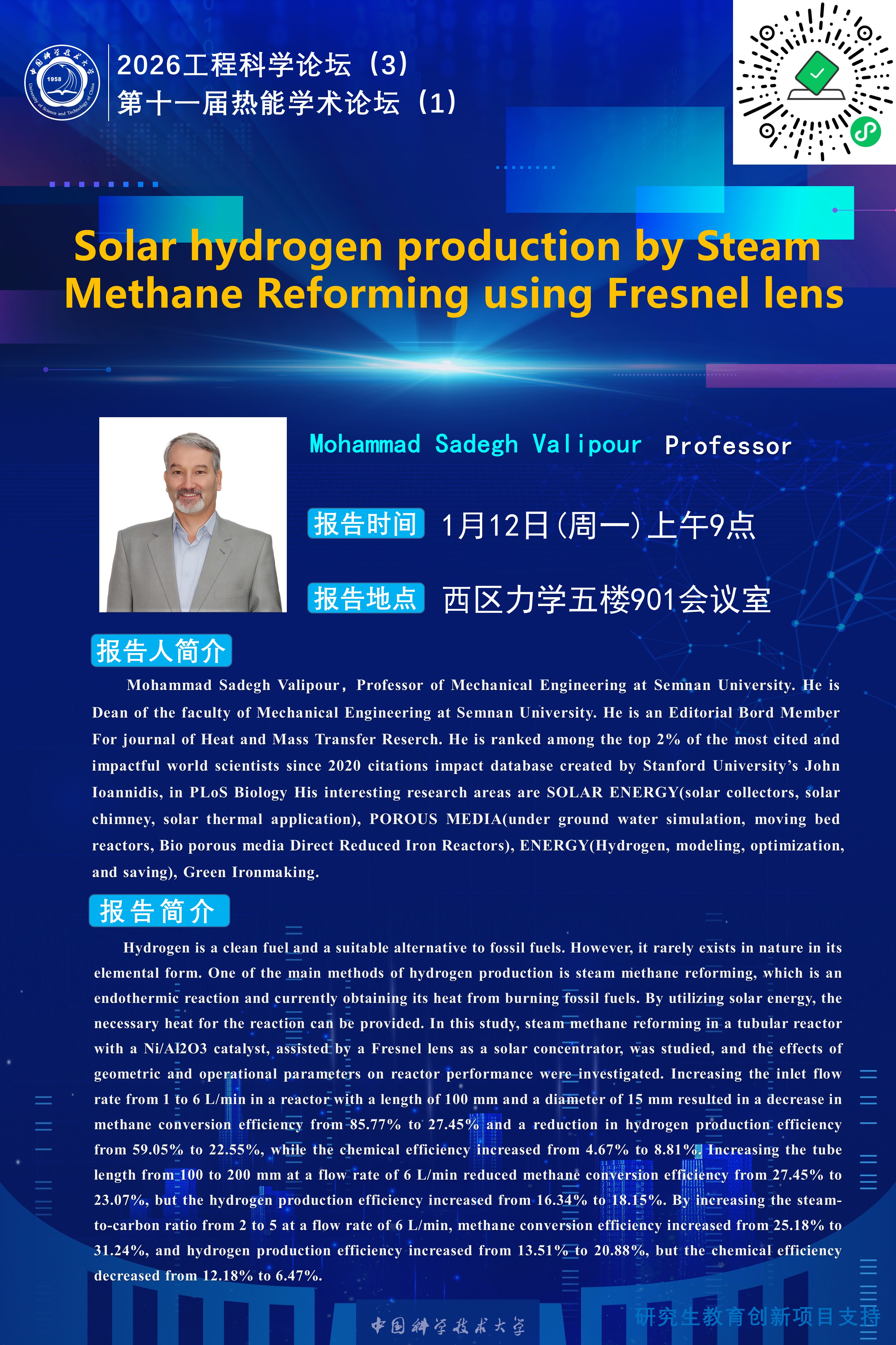 2026工程科学论坛(3)“Solar hydrogen production by SteamMethane Reforming using Fresnel lens”