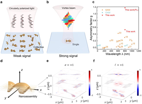检测分子的手性在光学、生物医学和材料科学等领域均有重要意义。如何用较少的手性分子得到强手光信号是手性光谱学追求的目标。然而,传统的圆二色谱法利用光子自旋角动量,即使检测大量手性分子得到的手光信号仍然很弱。该工作首先把手性分子的手性特征从分子尺度转移到微米尺度来保证与涡旋光的尺度匹配,再基于涡旋光与单个手性组装体之间的相互作用,得到了强手光信号。
